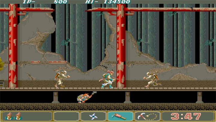 一款极佳的横向式卷轴经典动作游戏,它的特色在于优美的游戏画面,丰富的背景,并具有双重卷轴,让游戏中的场景更具深度.你在游戏中操纵一名忍者,要善用武士刀,手里剑,炸弹及锁链刀四种武器闯关,拿到某些宝物还能增强自己的攻击能力.敌人除了各式各样的忍者和浪人外,每关都有神秘的大头目