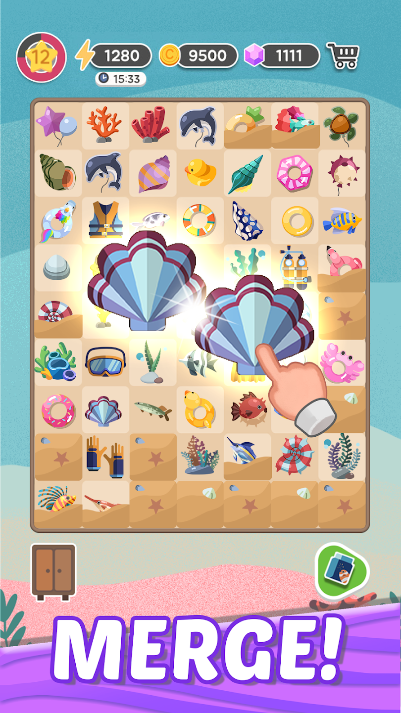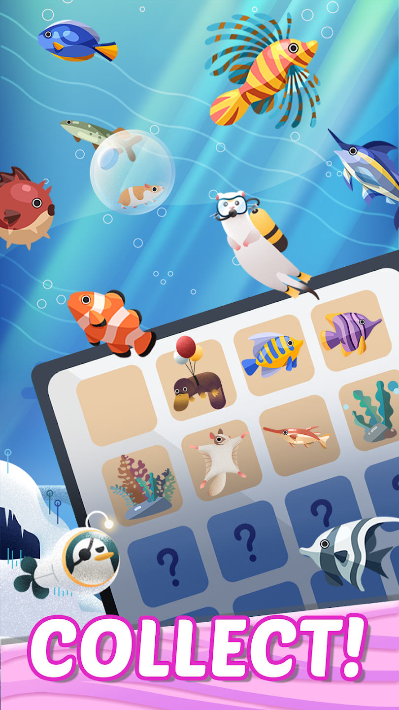 合并基本的海洋生物,创造出色彩鲜艳的鱼类、美丽的珊瑚和独特的装饰物。组合的越多,您的水族馆就越令人惊叹,也越丰富多彩!展现您的创造力,打造一个独一无二的水下世界。
