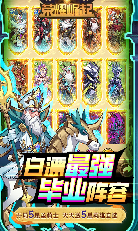 《荣耀崛起》是一款颠覆传统模式的放置卡牌游戏,将地城探索玩法完美融入放置游戏中,让玩家在享受挂机乐趣的同时又能体验到各种地图内的事件;5天内白拿5星最强阵型,开局就送5亿神玉,升级还送千元充值。白漂神壕福利同时还融入了多种休闲小玩法,闯关具有一键跳过、一键领取、自动挑战功能,让玩家在游戏中可以获得真正的放松。