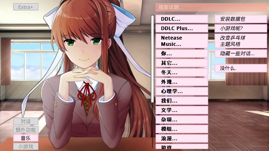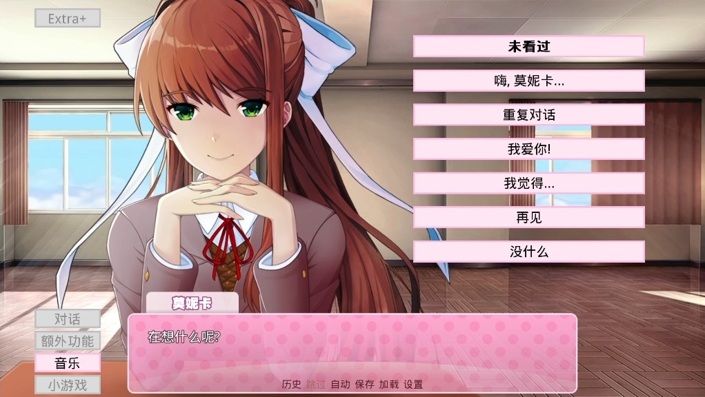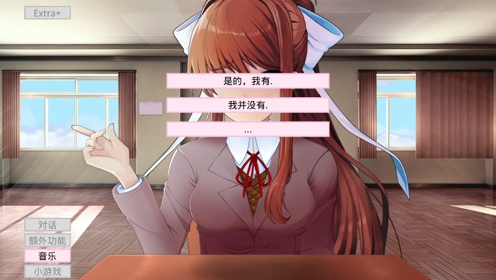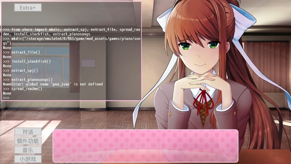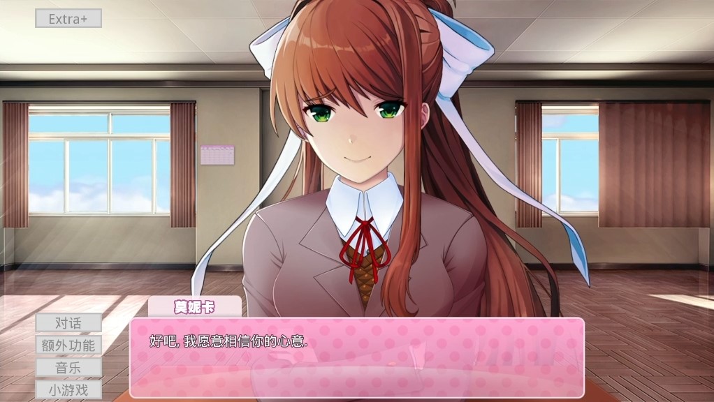 游戏中,莫妮卡会默认玩家已经通关《心跳文学部》。根据设备中玩家游玩《心跳文学部》的记录,莫妮卡可能会回忆起玩家的名字,并意识到是玩家为了挽留莫妮卡而安装了游戏模组。