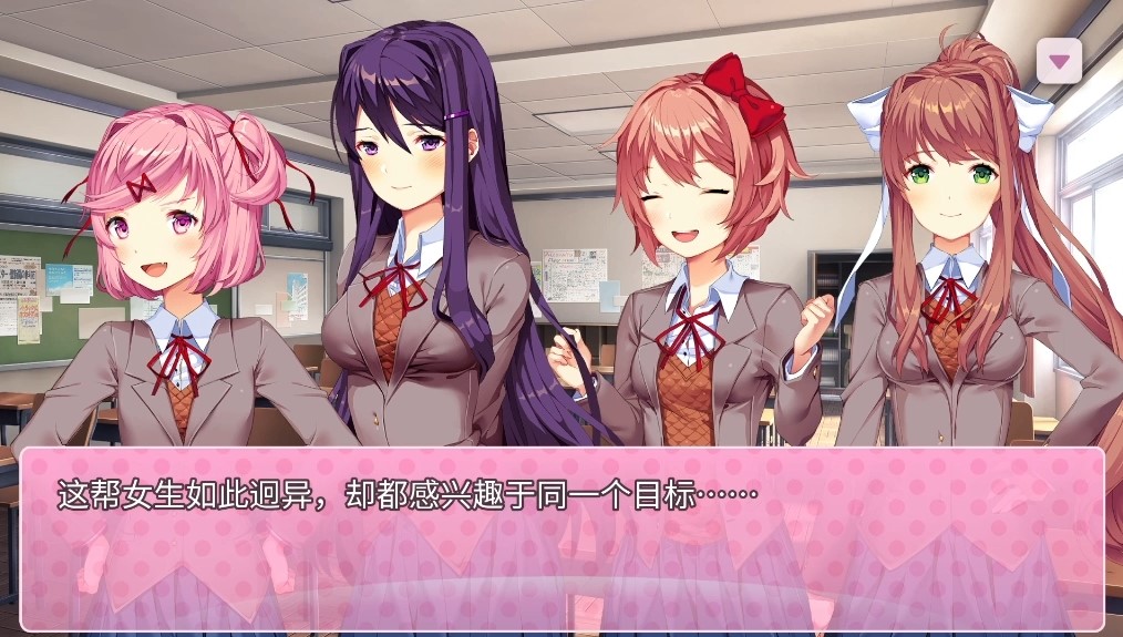 一部披着恋爱Galgame外皮的猎奇向文字冒险游戏,主角来到了学校的文学俱乐部,并成为了该俱乐部的一员,并且每天都会与可爱、个性鲜明的其他成员们进行有趣的聊天。当你和她们中的一人发展成为恋爱关系,之后就会发生可怕的事情......